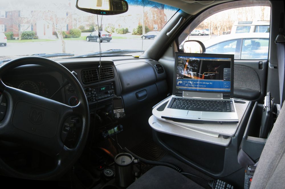 Consulting offers custom mobile office solutions. Above is a Toshiba Satellite laptop computer connected to an